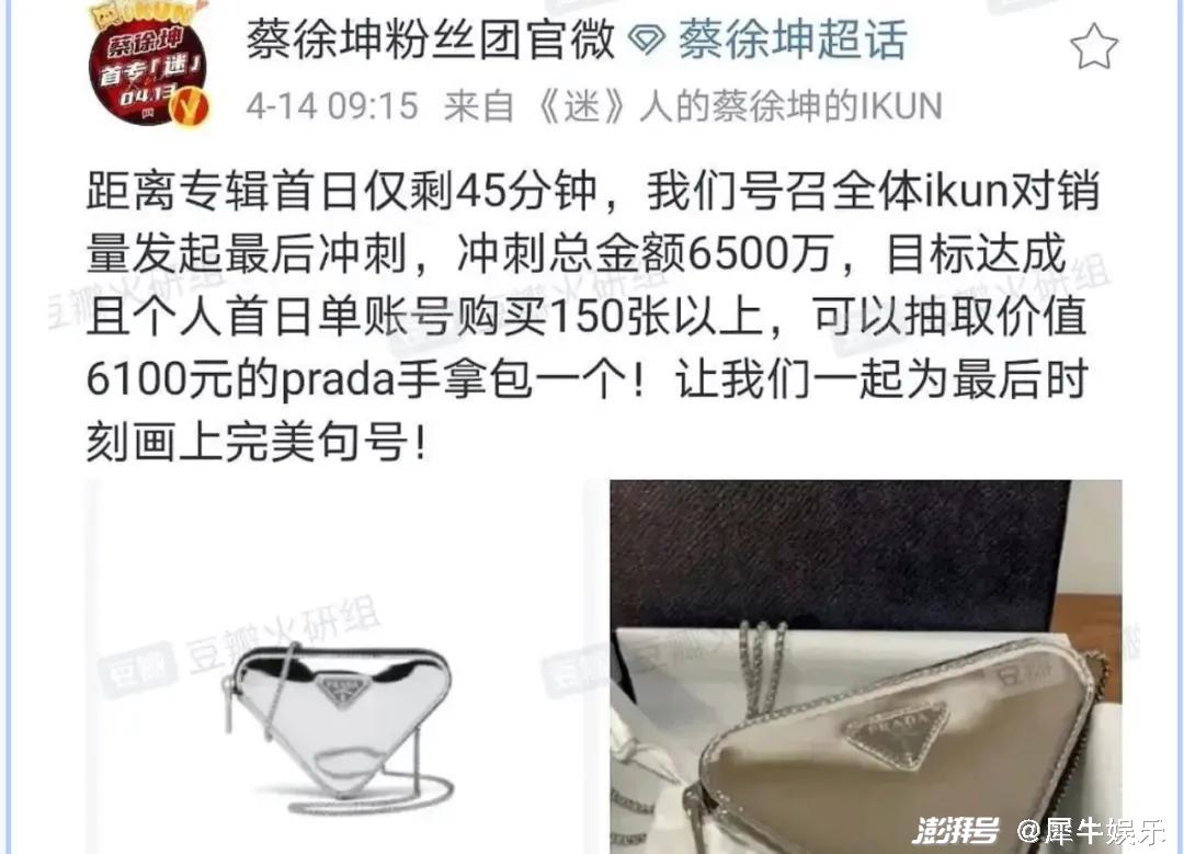 到了14日,蔡徐坤粉丝团官博更是下血本,为冲刺新专总销售额6500万,策划了“个人单账号购买150张以上,有机会抽取价值6100元prada手拿包一个”的活动,随后,被激发斗志的粉丝们开始了又一波花式筹钱。