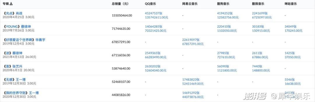 翻开数字专辑销量网的数据,截至发稿,各平台数字专辑销量排行的前7名作品分别是《光点》肖战、《YOUNG》蔡徐坤、《好想爱这个世界啊》华晨宇、《迷》蔡徐坤、《莲》张艺兴、《无感》王一博、《我的世界守则》王一博。