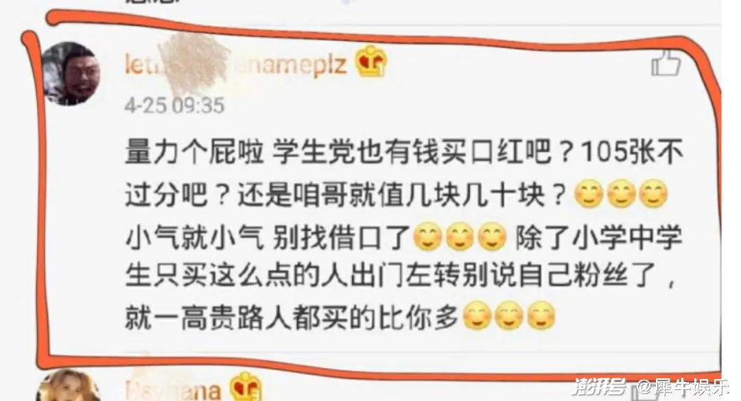 而诸如“你不多买一点你就是不爱他!”、“你买的没有路人多你算什么粉丝!”等饱含着情感绑架的话语,更是带动了一大批学生党粉丝透支自己的零花钱。