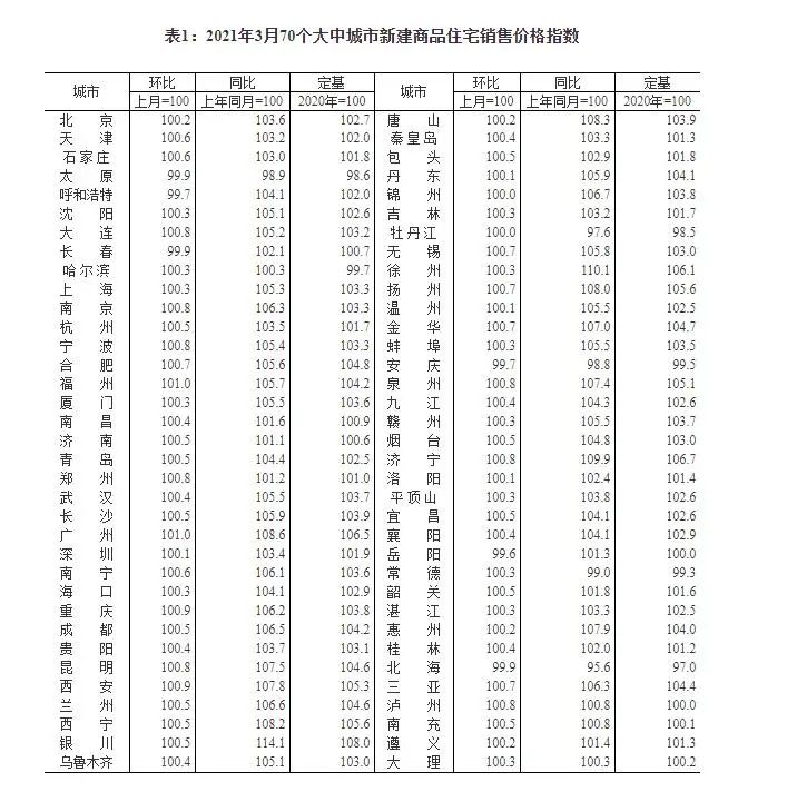 表1:2021年3月70个大中城市新建商品住宅销售价格指数
