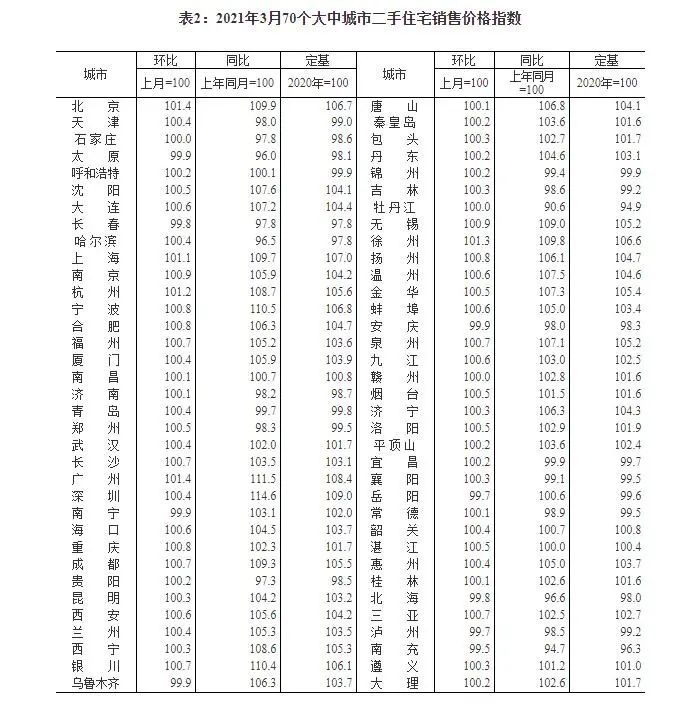 表2:2021年3月70个大中城市二手住宅销售价格指数
