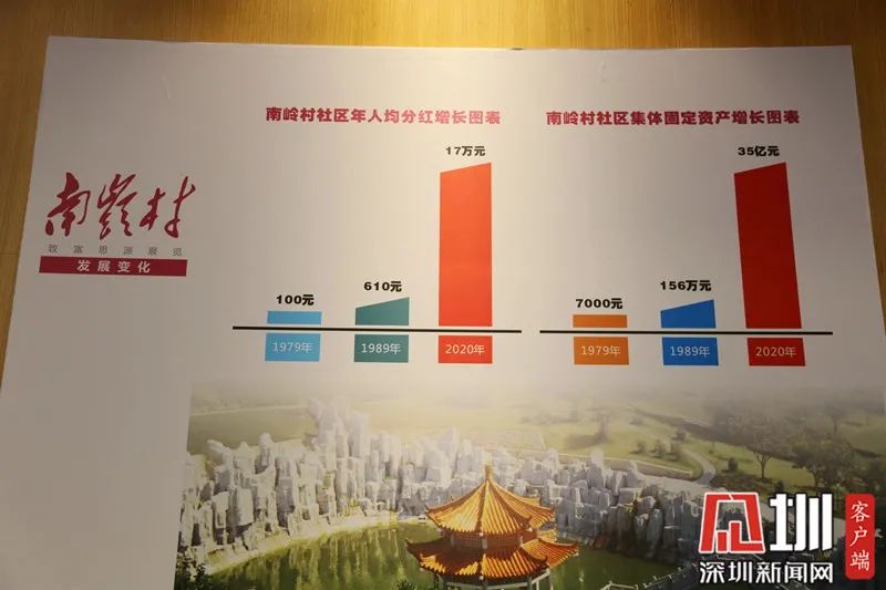 “已有500年历史的南岭村,从新中国成立至改革开放前三十年,村貌并无大变化。当时全村134户人家,596口人,以耕种为主,贫穷落后,人称‘鸭屎围’。全村共有四个生产队,集体固定资产只有7000元,人均年收入不足100元,吃粮靠返销,生活靠救济,生产靠贷款,在温饱无法解决的情况下,有一半人冒险逃往香港谋生。”展厅里第一篇“历史印记”中的这段话记录了过去南岭村的真实村况。