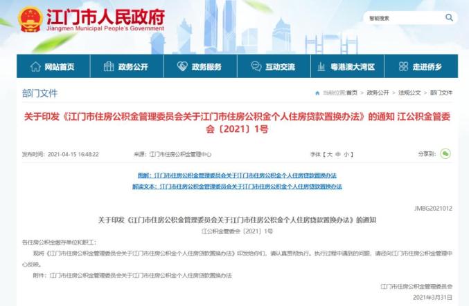 近日,江门公积金中心发布《江门市住房公积金管理委员会关于江门市住房公积金个人住房贷款置换办法》的通知。