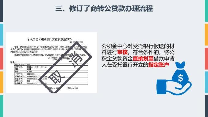 《贷款置换办法》修改为:“公积金中心对受托银行报送的材料进行审核,符合条件的,将公积金贷款资金直接划至借款申请人在受托银行开立的指定账户。”