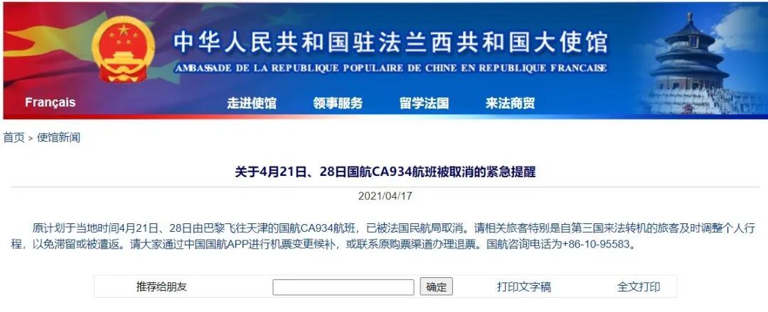 中国驻法国大使馆发布紧急提醒,原计划于当地时间4月21日、28日由巴黎飞往天津的国航CA934航班,已被法国民航局取消。请相关旅客特别是自第三国来法转机的旅客及时调整个人行程,以免滞留或被遣返。请大家通过中国国航APP进行机票变更候补,或联系原购票渠道办理退票。国航咨询电话为+86-10-95583。