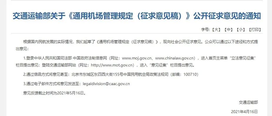 交通运输部关于《通用机场管理规定