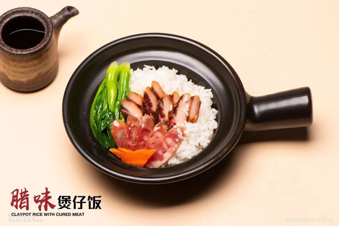 腊味煲仔饭作为煲仔饭中的“经典款”,厦航空厨甄选历史悠久的中华老字号“皇上皇”腊肠及腊肉作为主料,腊肠质地红润,腊肉金黄,油而不腻,搭配火烧丝苗米饭,机上烤箱加热后,覆盖在米饭表面的腊肉、腊肠的肉汁温柔地、全面地渗透了丝苗米饭,揭开盖子,米香肉香扑面而来。