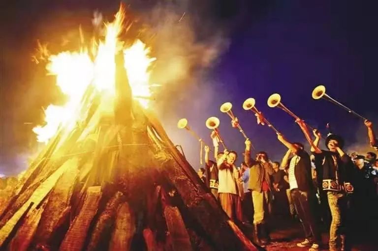 彝族“火把节”彝语称之为“朵扔吉”,源于彝族十月太阳历,是彝族非常古老的传统节日。彝族历法中记载,每年五月初五,南方的火星之神开始游降,六月初五临地,火星之神临地会出现火灾,故六月二十四傍晚,彝族布耄即用一根麻线捆吊一象征宇宙的鸡蛋,挨家逐户吟念经咒,收拾不规矩的失散火种。待布耄祭祀火神后,众人再取新火种依原路返回,从家门上方接回炉中,并从炉中点燃火把,聚集在备好的柴堆上,借助熊熊火光欢唱、跳舞。后来此种仪式经过发展演变,增加了歌舞表演、服饰展示、斗牛、赛马、摔跤、打陀螺、荡秋千等活动内容,成为今天的“火把节”。