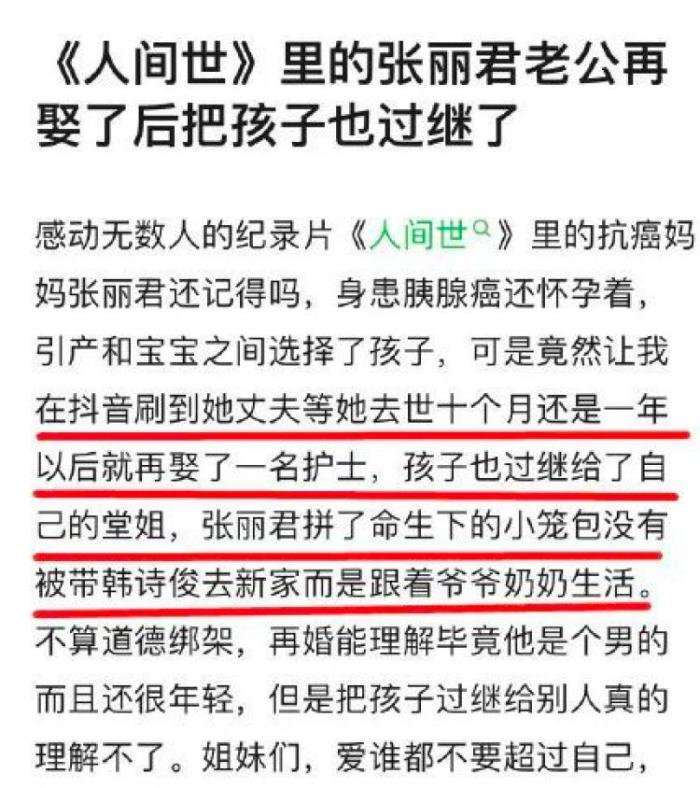 《人间世张丽君去世一年,老公再娶,孩子过继,家里的喜字还没擦掉》、《张丽君舍命产子,去世一年后老公再婚:女人,你最应该好好爱自己》一条条触目人心的标题,仿佛成了控诉丈夫的最好证据。