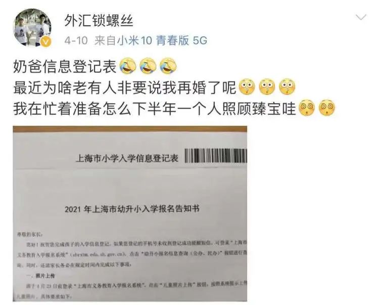 今年清明时分,他还在微博上更新了祭扫的图片。4月10日,他还发出了一张“奶爸信息登记表”,两人的孩子到了幼升小的年纪,为孩子入学做准备。