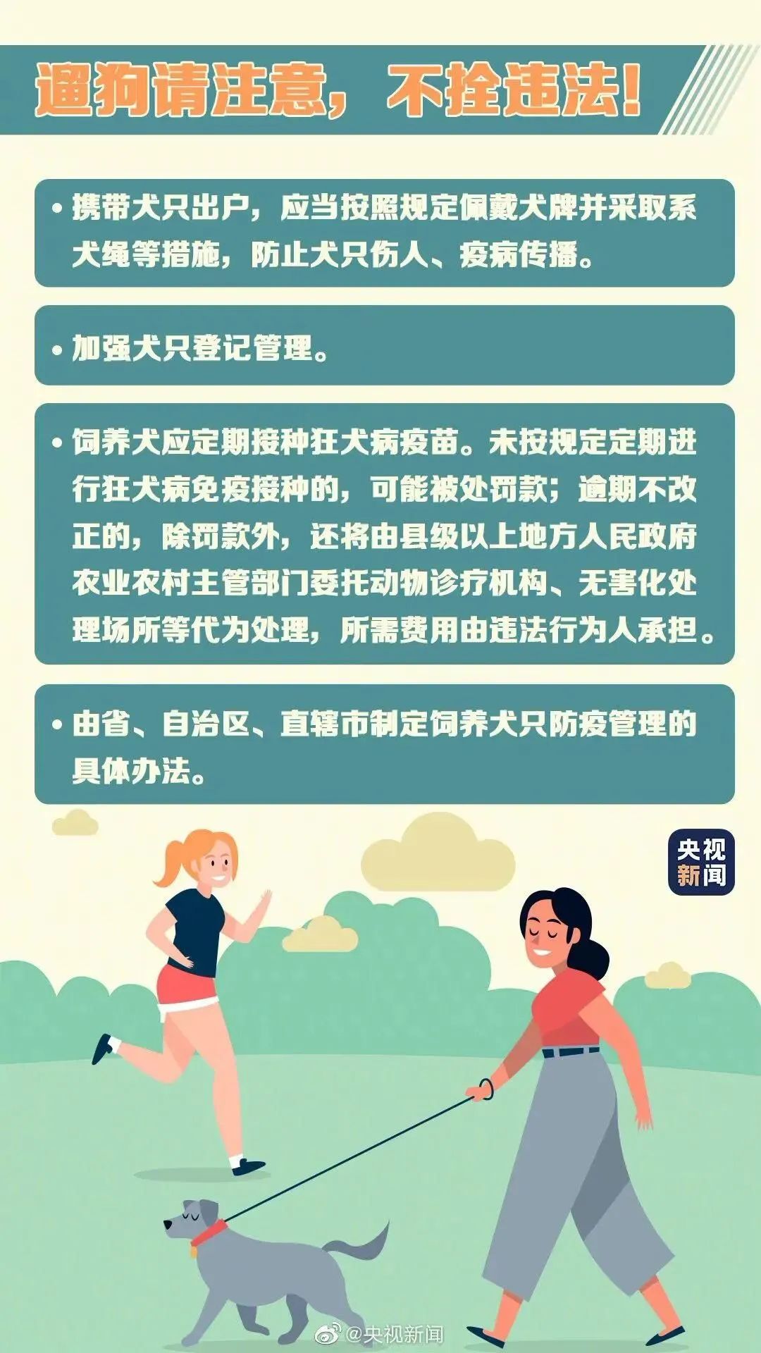 5月1日起,新《中华人民共和国动物防疫法》施行。第30条明确规定:单位和个人饲养犬只应按规定定期免疫接种狂犬病疫苗,携带犬只出户的,应按规定佩戴犬牌并采取系犬绳等措施。(央视新闻)