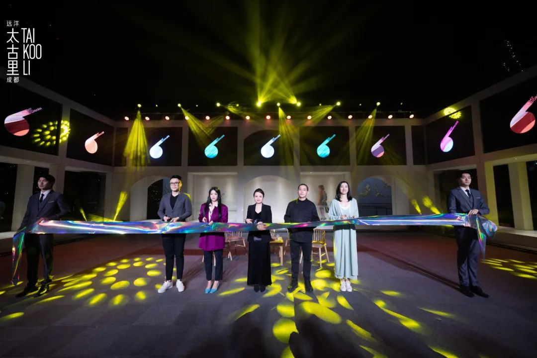剪彩仪式 - 左起:新媒体视觉装置艺术家穆磊先生、策展人张红雷女士、成都远洋太古里总经理伍玉珊女士、新媒体视觉数字艺术家大悲宇宙-林琨皓先生、新媒体艺术家刘佳玉女士