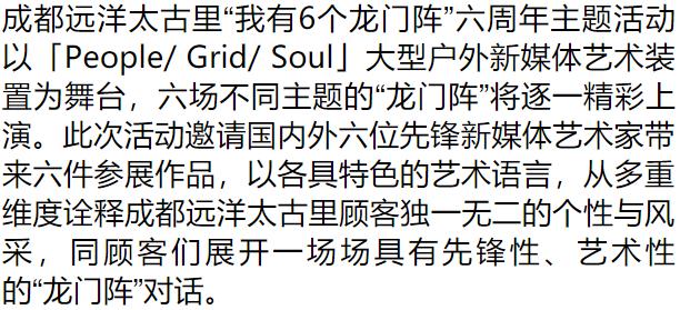 成都远洋太古里“我有6个龙门阵”六周年主题活动期间还将带来一系列精彩互动: