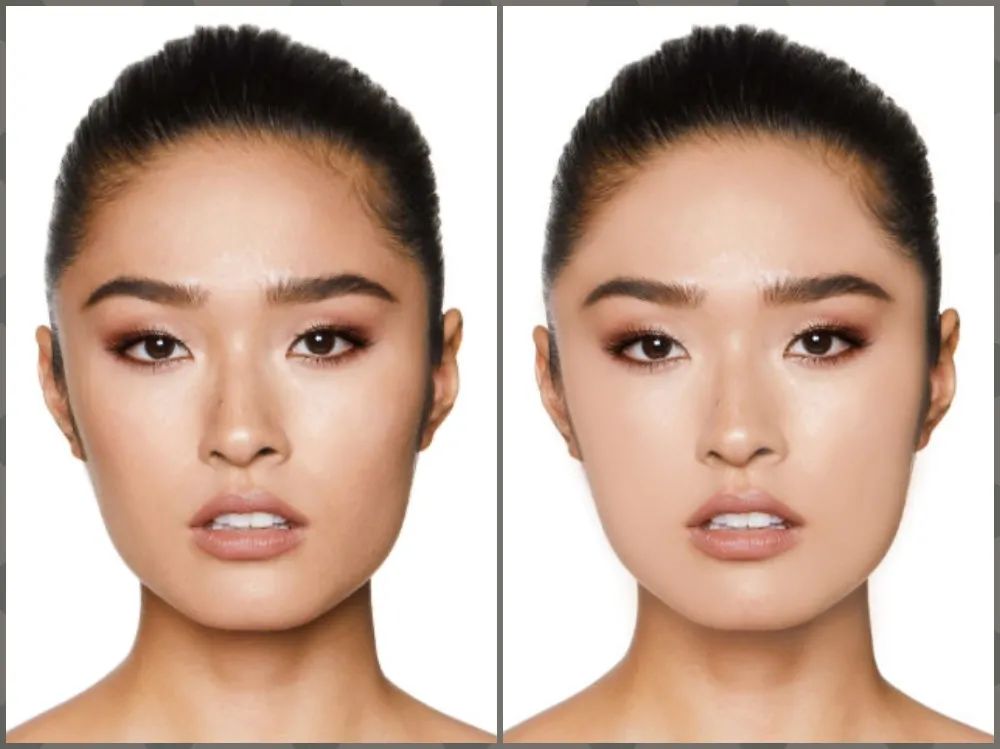 左图是画了修容的原图,右边我把脸部的阴影P淡了,是不是右边明显变宽变平?但是它们的实际宽度真的一点都没有变化!