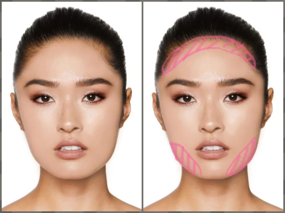 下巴高光可以让下巴变得翘起来。正面的颧骨一带扫扫高光,不仅能让苹果肌比较饱满,还是让皮肤显得透明水润的妙法。你会遇见镜子就忍不住左右转头,感叹今天皮肤真好!