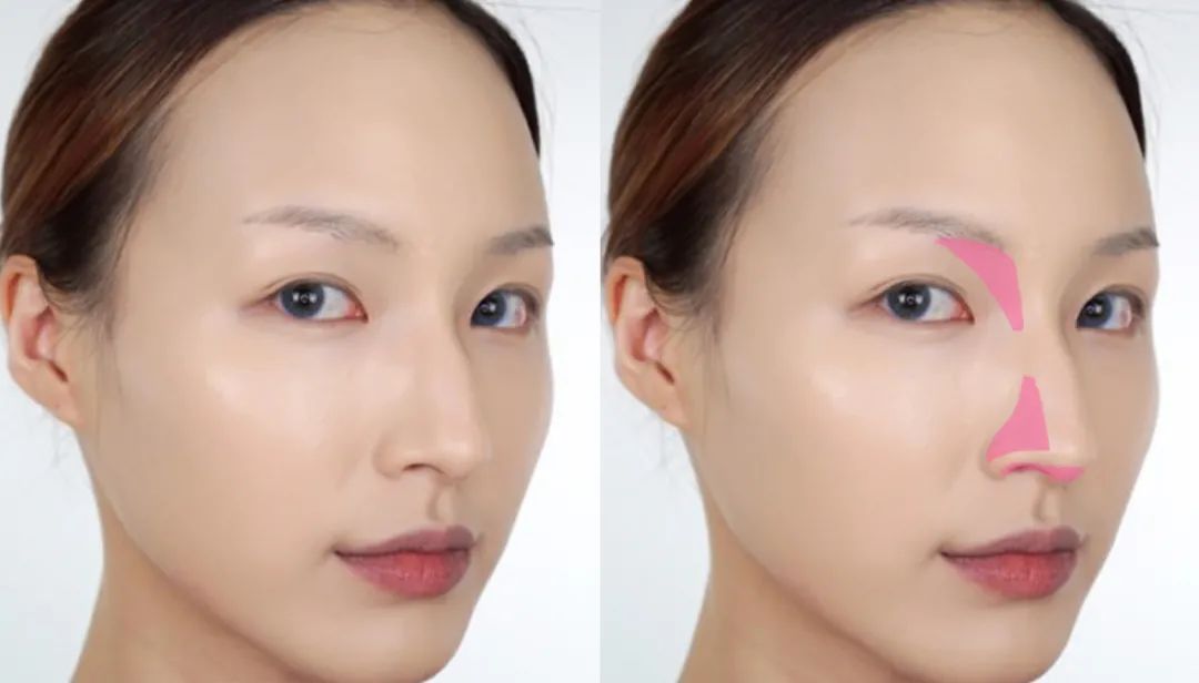 鼻子高光推荐扫眉头中央往下到鼻梁中间这一块,这样可以让山根饱满起来。不推荐鼻尖高光是因为它不自然而且挑人,很可能把修小的鼻头又变大了。而且鼻头本就容易出油,画了高光,油上加油会惨不忍睹。不过鼻头小巧或者为了拍照的同学,画一画玩也没什么不可啦。