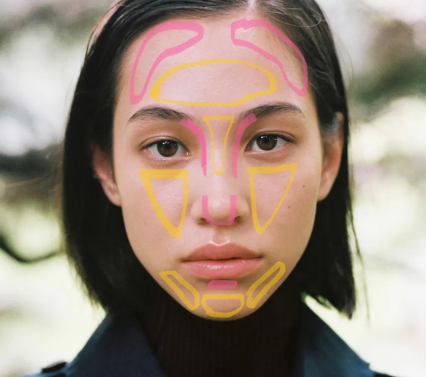 稍微侧过一下脸,将阴影顺着颧骨往前扫,一直扫到从正面看过去颧骨的那个“凸”被扫平的位置为止,上图左粉色的部分是一个大致的示意。然后可以将阴影粉往下带,扫出侧颜的阴影,如黄色斜线部分示意。