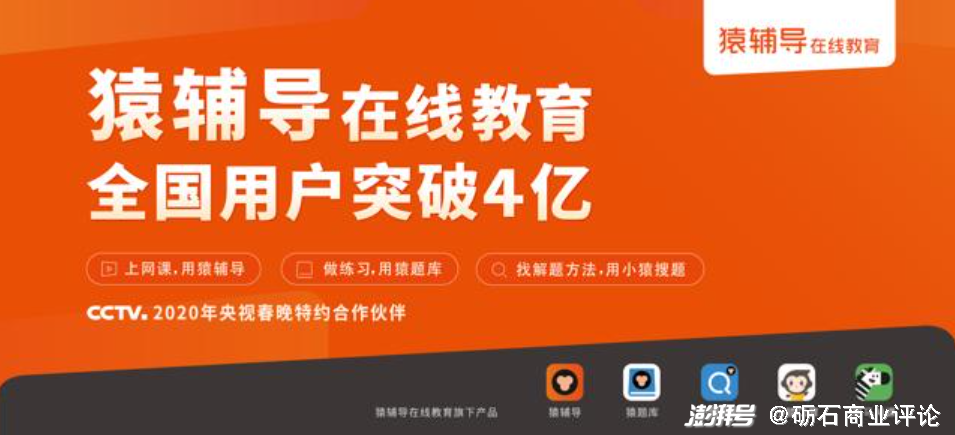 但大部分融资都被用在了广告投放上。早在2015年,猿辅导就投放了湖南台《天天向上》节目,2018年成为《最强大脑》的合作方,2020年成为CCTV《中国诗词大会》(第五季)独家互动合作伙伴。在2020年一季度,电视上、电梯间里乃至2020年的春晚,到处可见猿辅导的橙色Logo,和“累计用户4亿人”的广告语。