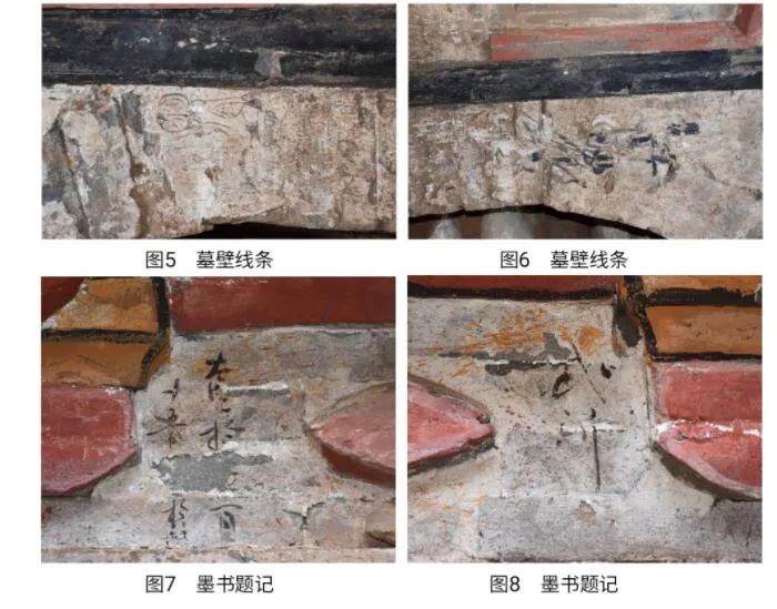 戴庄金代砖墓的东西两壁为宋金时期常见的“妇人启门图”,格子门的雕刻十分写实,表现出格眼、腰花板、障水板三部分结构,并雕刻出边框上的桯线,格眼、障水板上还雕有精美的图案,以花卉和方格纹为主,其上还有口衔仙草的鹿和婴戏图;东南壁和西南壁中间雕刻直棂窗。南壁为墓门所在,墓门两侧以墨线简单的绘出两幅图案。彩绘上还有墨书题记,东壁拱眼壁上有墨书题记“大定拾□□月十五日□□於兹”;北壁拱眼壁内题“武□”。出土有1件破碎黑釉瓷罐、1件残损瓷碗。