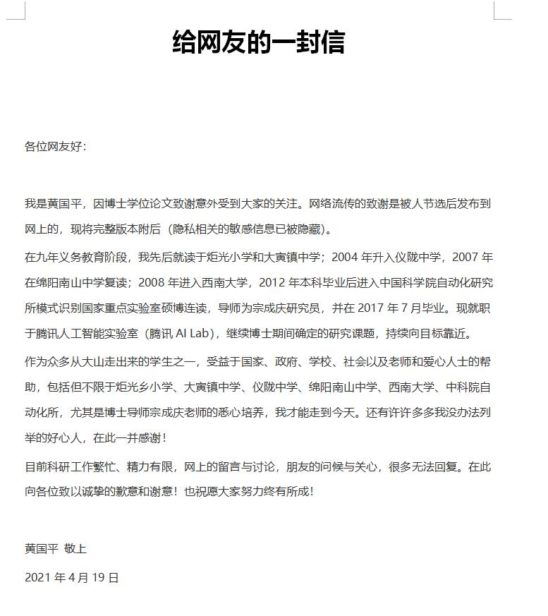 博士论文致谢部分在网络意外走红后,19号,博士本人回信网友,并表示目前科研工作繁忙,精力有限,“网上的留言与讨论,朋友的问候与关心,很多都无法回复,再次向各位致以诚挚的歉意和谢意,也祝愿大家努力终有所成。”