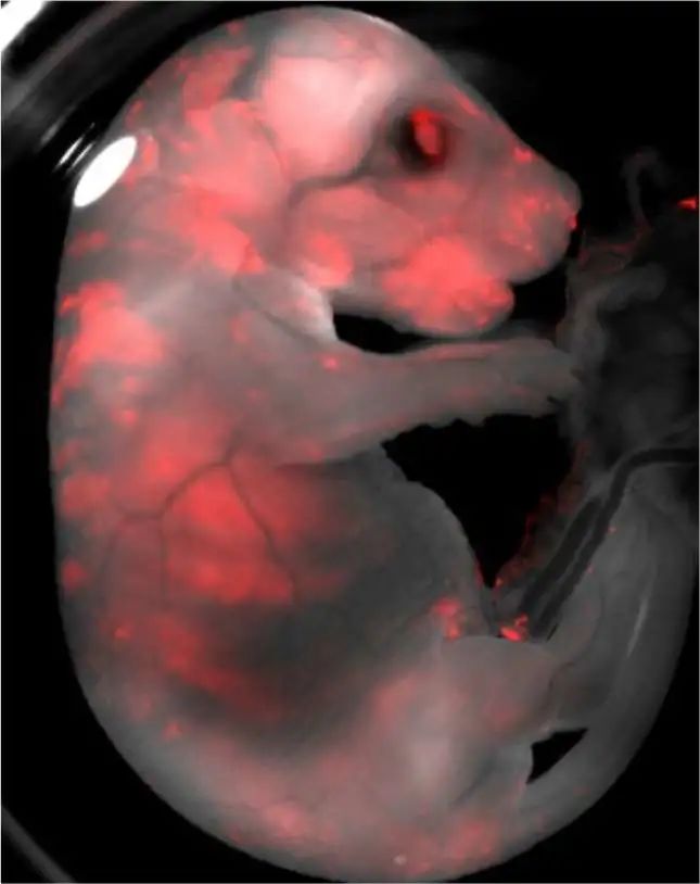 大小鼠嵌合胚胎,红色为大鼠细胞