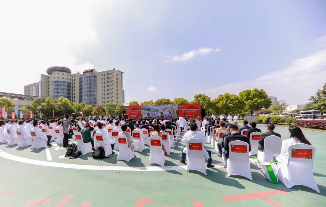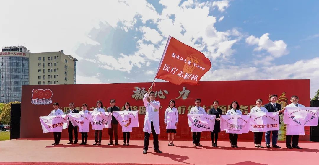 ▲现场为“循浦江之源·筑公济医魂”医疗公益志愿服务项目的8支专科分队授旗。