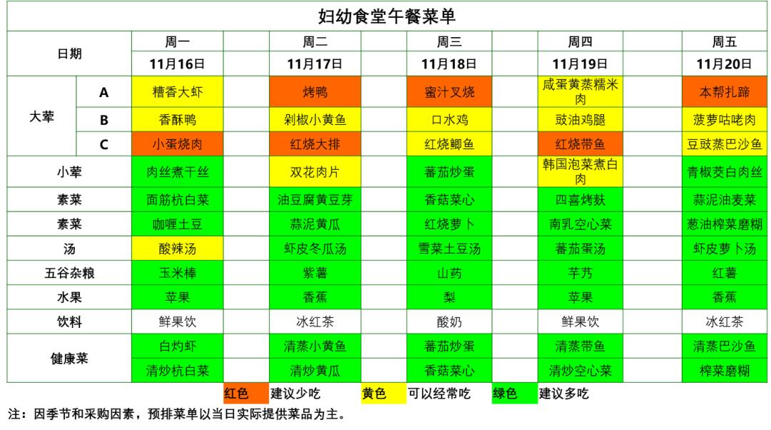 食堂供餐菜肴、主食品种丰富;供餐满足粗细搭配。早餐至少供应5种食物,午餐至少供应10种食物;每周至少供应4种谷薯杂类食物、10种蔬菜水果类食物、5种水产禽畜蛋类食物、2种奶及大豆类食物;每周菜品中严格控制油炸类菜品,占比不超过1/10。每日供应低盐少油减糖菜品,每日主食中供应粗粮、杂粮、杂豆或薯类。每日供应菜品设营养标识,进行公示;用红黄蓝三种颜色表示食品健康等级,给予建议。记录每月食用油、盐、糖的使用量;根据每日就餐人数计算每人食用油、盐、糖的摄入量。“三减”措施推广以来,食用油、盐、糖总量及人均食用油、盐、糖的使用量较创建之初都有所下降。