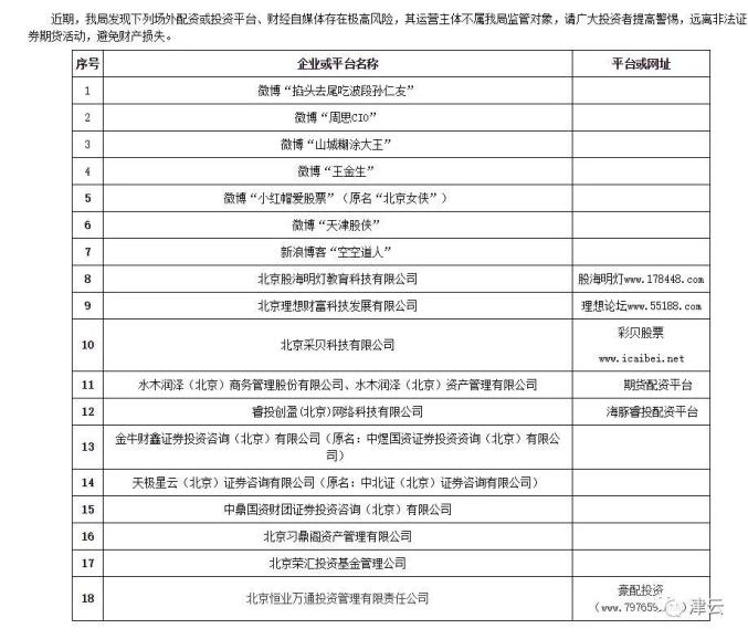 中国证监会北京监管局昨日通报第七批《北京辖区不具备经营证券期货业务资质机构名单》,该名单共18个企业或平台名称,含微博“天津股侠”、微博“小红帽爱股票”、微博“王金生”、股海明灯网站等,上述微博“大V”拥有数百万粉丝。北京证监局表示,近期,发现上述场外配资或投资平台、财经自媒体存在极高风险,其运营主体不属我局监管对象,请广大投资者提高警惕,远离非法证券期货活动,避免财产损失。