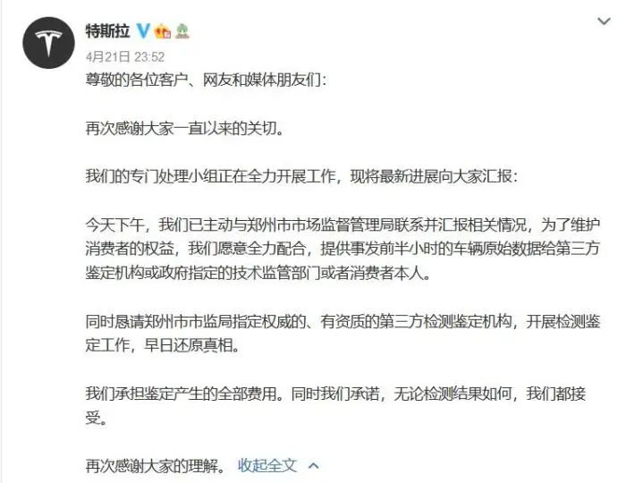特斯拉午夜再发声。特斯拉官方微博21日晚发布声明称,已主动与郑州市市场监督管理局联系并汇报相关情况,愿意全力配合,提供事发前半小时的车辆原始数据,并承担鉴定产生的全部费用,且无论检测结果如何都会接受。