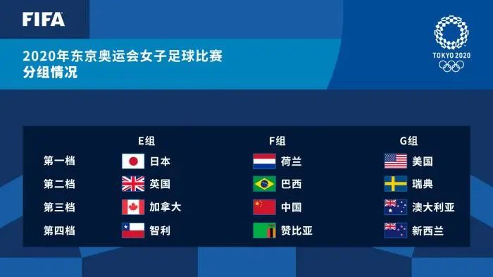 21日下午,东京奥运会女足抽签仪式落幕。中国女足同荷兰、巴西、赞比亚女足分在F组。日本、英国、加拿大、智利女足同处E组,美国、瑞典、澳大利亚、新西兰被分在了G组。