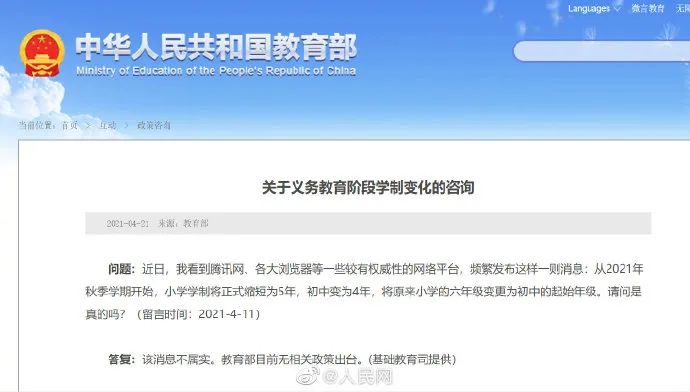 近日,网传“从2021年秋季学期开始,小学学制将正式缩短为5年,初中变为4年,将原来小学的六年级变更为初中的起始年级。”对此,教育部回复:该消息不属实。教育部目前无相关政策出台。