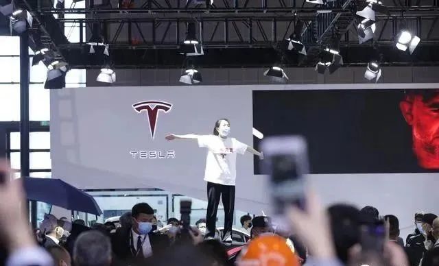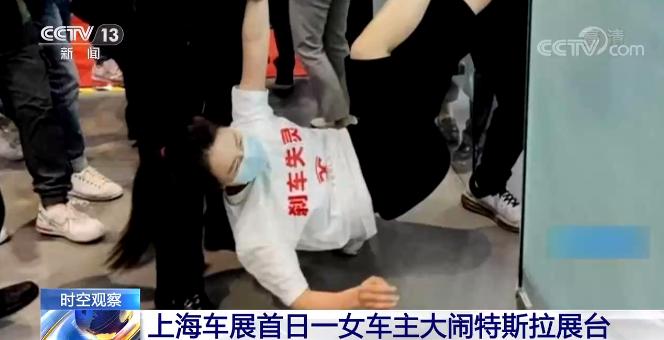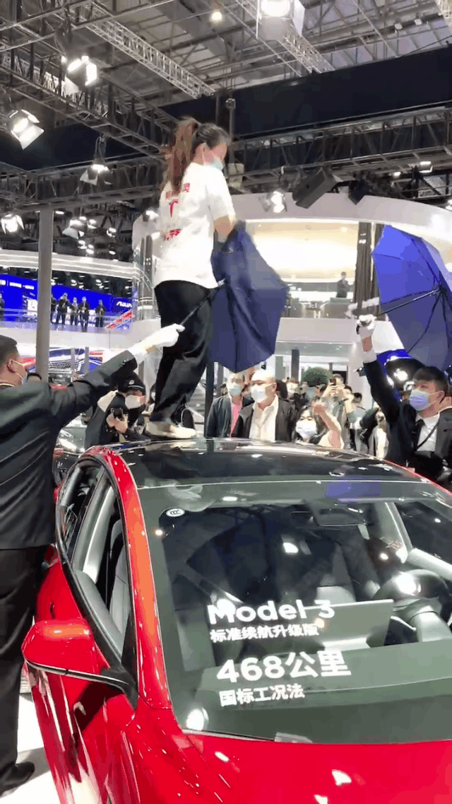 4月19日,上海车展首日,两女子在特斯拉展台维权,其中河南车主张女士爬上特斯拉展车,站立高呼“特斯拉刹车失灵”。