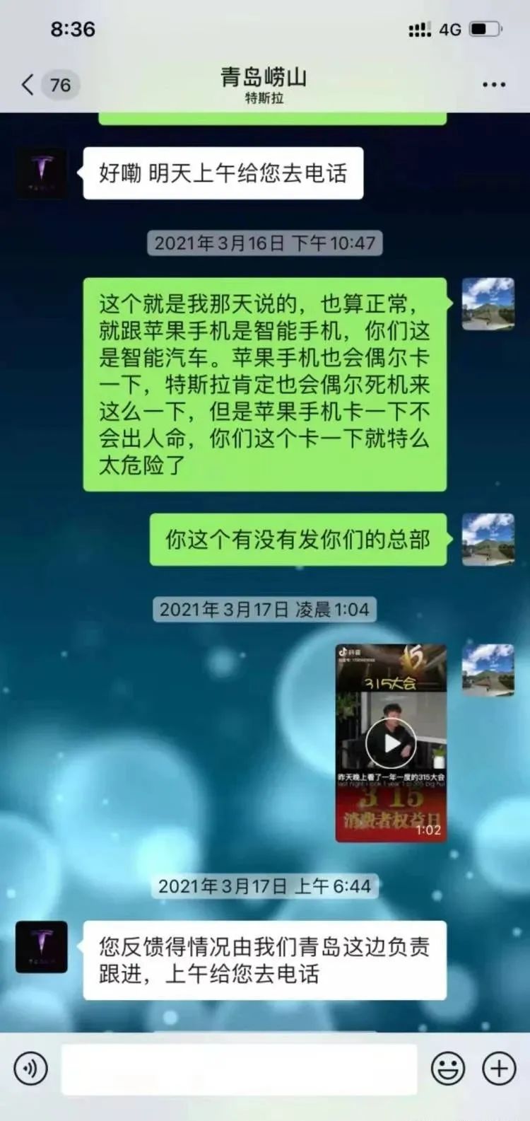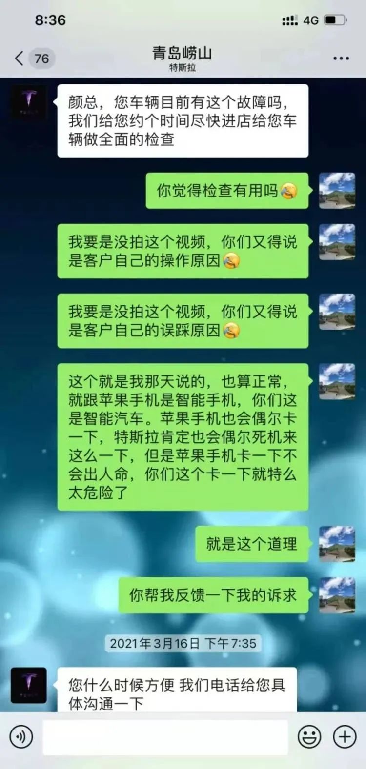 “奔着友好和平解决的态度,我3月份先给特斯拉微信公众号发的消息,然后又发给特斯拉崂山服务中心。”他说,当时的自己没想把事情闹大,也就没在社交媒体发布相关视频证据。“没必要,你给我换一辆就行了。”颜先生如今愤愤不平地说,这是他当时的最大诉求,所以选择了3·15前后这个节点来处理这件事。
