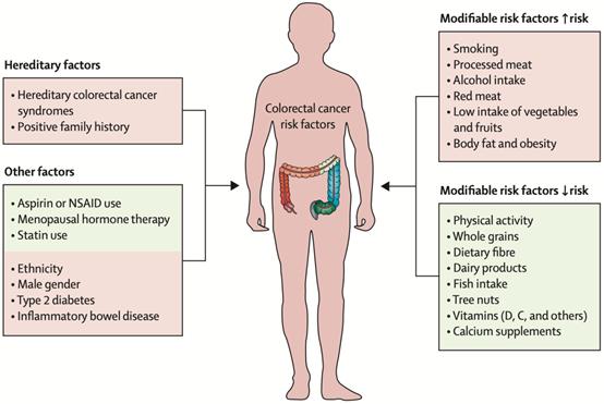 近期发表于Lancet的一篇综述对影响大肠癌发生的遗传和环境因素进行了归纳[2],再次强调了吸烟、红肉的摄入、低膳食纤维、肥胖等因素可影响大肠癌的发生。