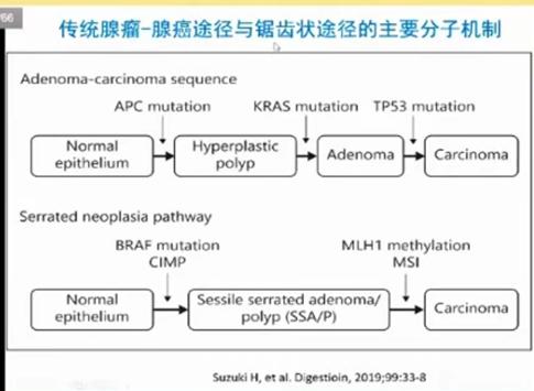传统腺瘤-腺癌与锯齿状途径的主要分子机制是不同的。腺瘤-腺癌早期为APC基因突变,最后是TP53突变,而锯齿状途径早期为BRAF的突变以及CpG岛出现甲基化,后期时存在微卫星不稳定。