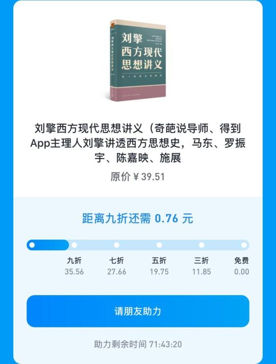 “0元得纸质书活动”规定每位用户每周可以为4个朋友助力各一次,每次可减0.5元,新用户减5元。据黄涛的观察,这个活动的吸引力挺大,“有些人天天在群里发助力的书链接。”