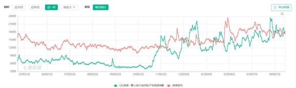 时间维度拉长到一整年,微信读书的数据与QQ阅读的数据也不相上下。