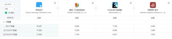 撇开网络小说平台,单就出版文学电子阅读平台而言,微信读书下载量占据了这个领域头把交椅。背靠阅文集团,微信读书占据了中文图书版权优势,在大家没有注意到的地方,微信读书横扫了电子阅读战场。