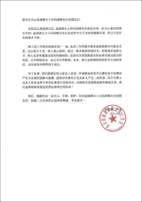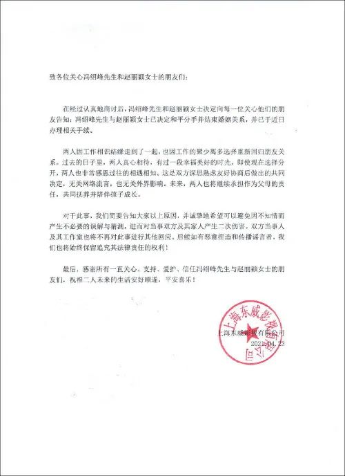 今天(4月23日)上午10时整,演员赵丽颖和冯绍峰工作室同时发布声明称,两人已决定和平分手并结束婚姻关系,并已于近日办理相关手续。