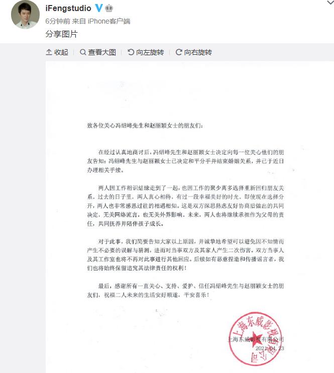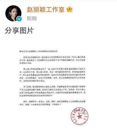 原标题:《刚刚!赵丽颖和冯绍峰宣布离婚!》