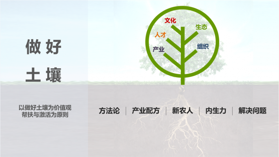 田岗的生长来自于土壤的厚度和营养。通过方法论、产业配方、新农人、内生力和解决问题五大维度培育乡村土壤,最终实现五大振兴。