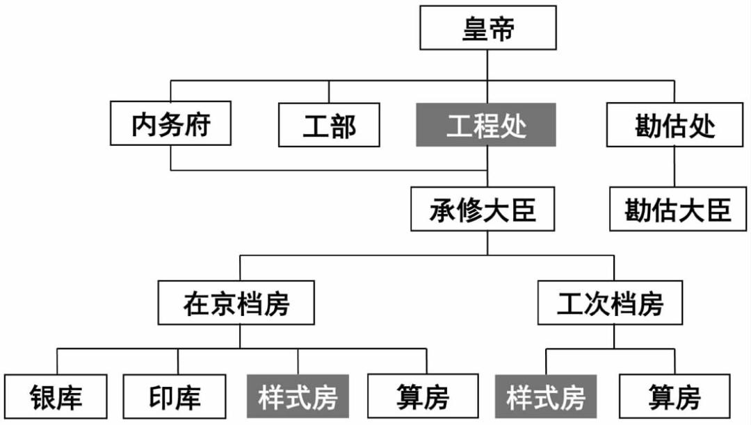 清代国家建筑工程的管理,承袭明代制度,以工部为最高行政机关,“掌天下造作之政令及其经费” 。其中有“营缮清吏司”专管都城、宫苑、坛庙、衙署、府第、仓库、营房等工程;“都水清吏司”主管江海河渠修防及造船事务;“屯田清吏司”负责皇家陵寝及王公百官坟茔建筑制度及营缮的管理。此外,管理宫廷事务的内务府也有“营造司”等机构分管官苑建筑,除重大项目会同工部办理外,主要承办岁修即寻常维修工程事务。