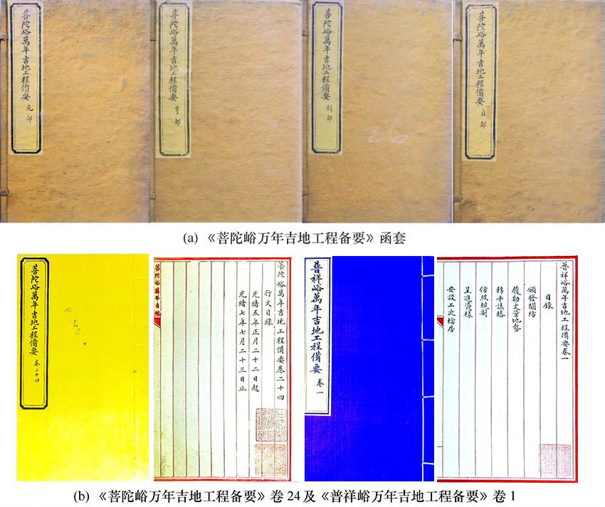 《工程备要》多系专门缮造,书写极工整,编排有序,装帧精美,实例如中国科学院图书馆藏《平安峪万年吉地工程备要》及《工程续要》《菩陀峪万年吉地工程备要》和《普祥峪万年吉地工程备要》 等。