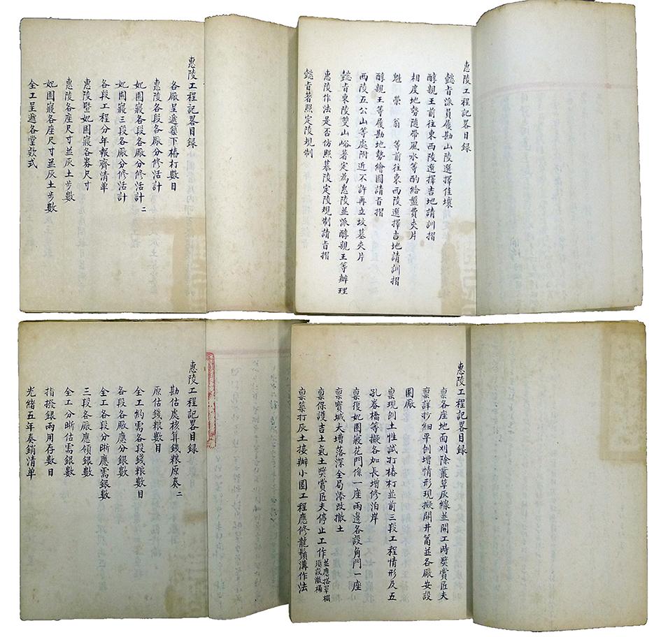 清代各陵寝工程规模浩大,向称“山陵大工”,工料耗银动辄数百万两;相关工程技术也最为复杂,分工细密,工种常达数十种,工序也多而繁杂,往往招商多家分包,工匠民夫每每逾万,工期更常逾数年乃至一、二十年。与此相应,陵寝工程的经营管理也有一套细微繁复的制度,成为清代建筑工程工官制度的典型;而在工程经营过程中产生的各类工程籍本的浩繁程度,也最具典型。其中,后期各陵寝的原始档案及各类工程籍本,更至今十分丰富详备地大量遗存;借助于这些文献,可以较完整系统、也较为具体地了解清代陵寝建筑工程工官制度的各种详情细节,以及各种工程籍本产生与传世的情况。