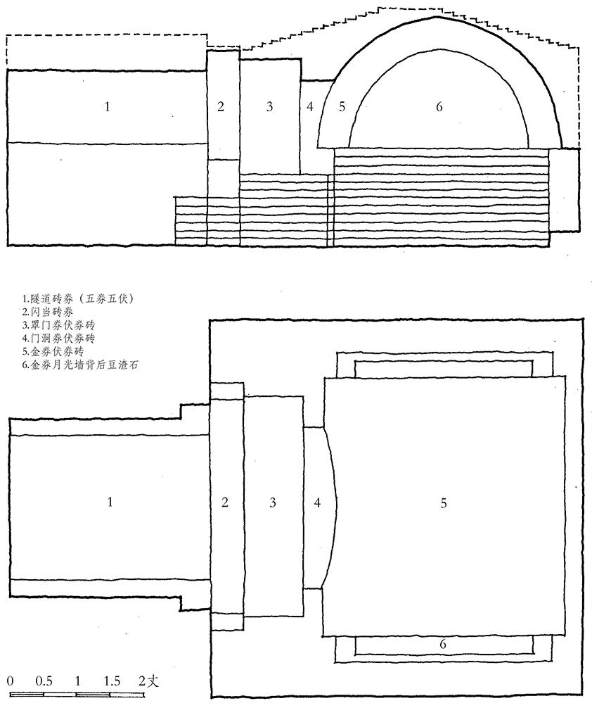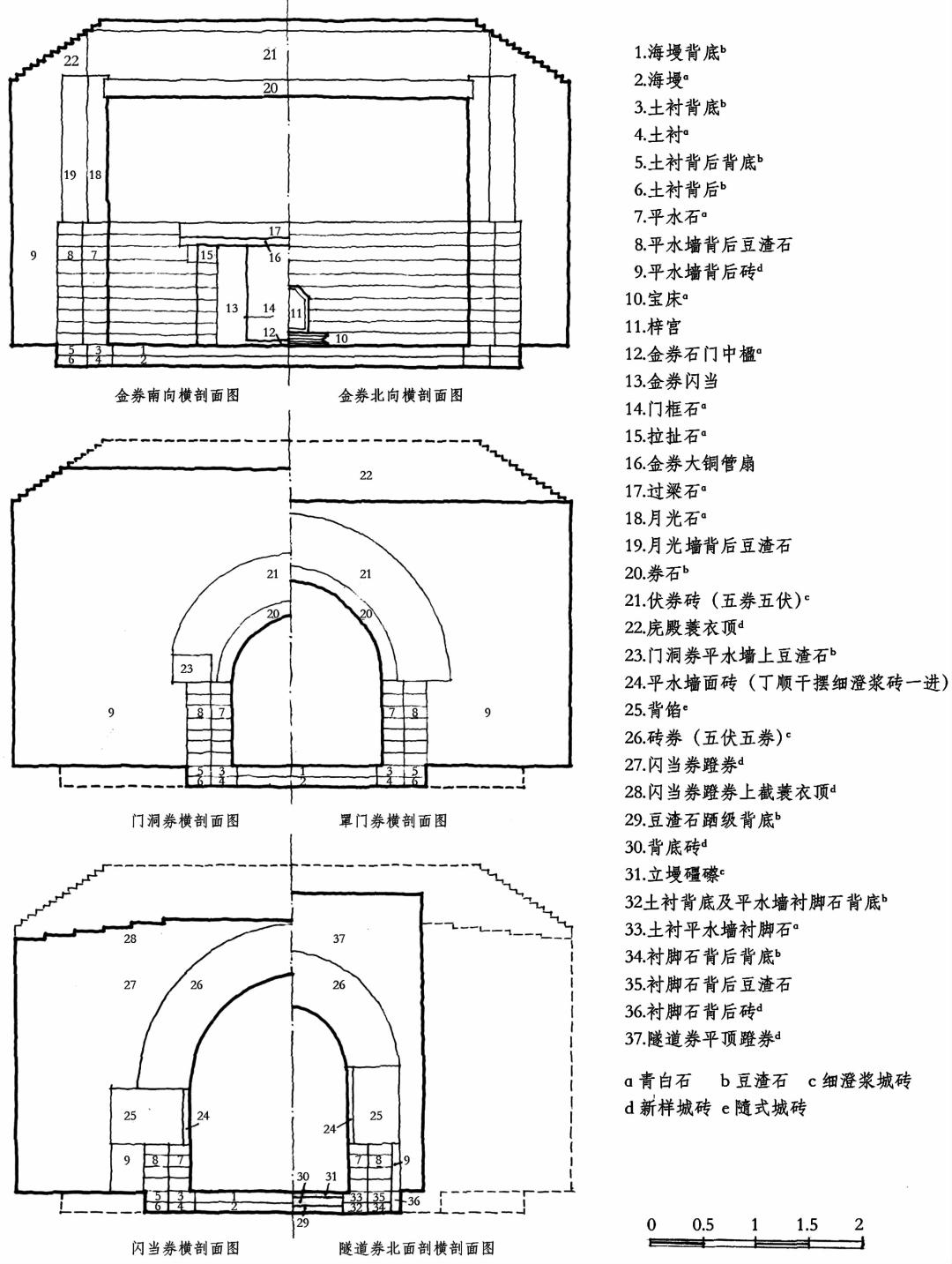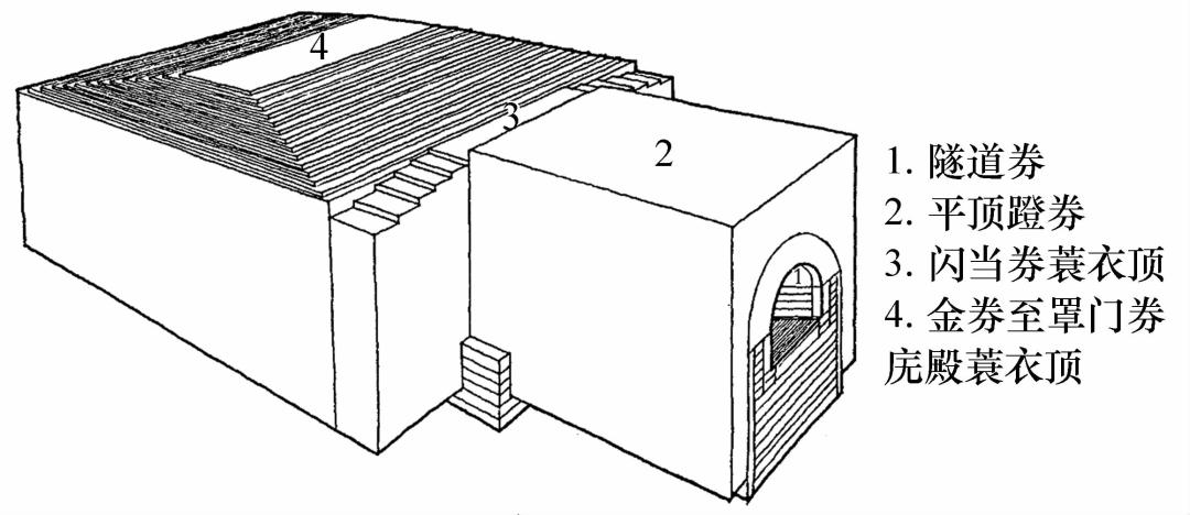 从地宫各券座墙体往上,是石或砖结构的拱券和覆盖拱券结构的砖构“蹬券”、“蓑衣顶”等。地宫拱券结构构造层次的剖析,同前述地宫墙体结构的剖析过程基本相同,只是形制变化更多,尺寸更多更错综复杂,需要更细致复杂的大量推算分析和综合工作才能完成。