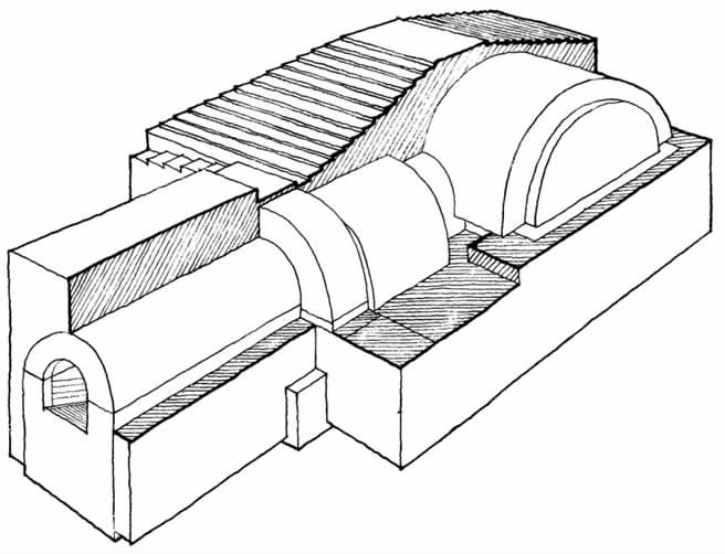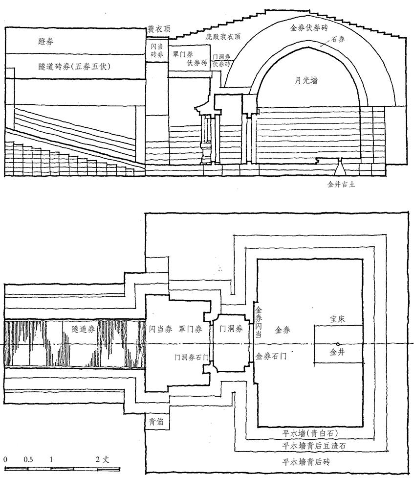 图11 菩陀峪定东陵地宫砖券、石券、伏券砖、平水墙及背后、蓑衣顶形制复原图(推算依据同图6)