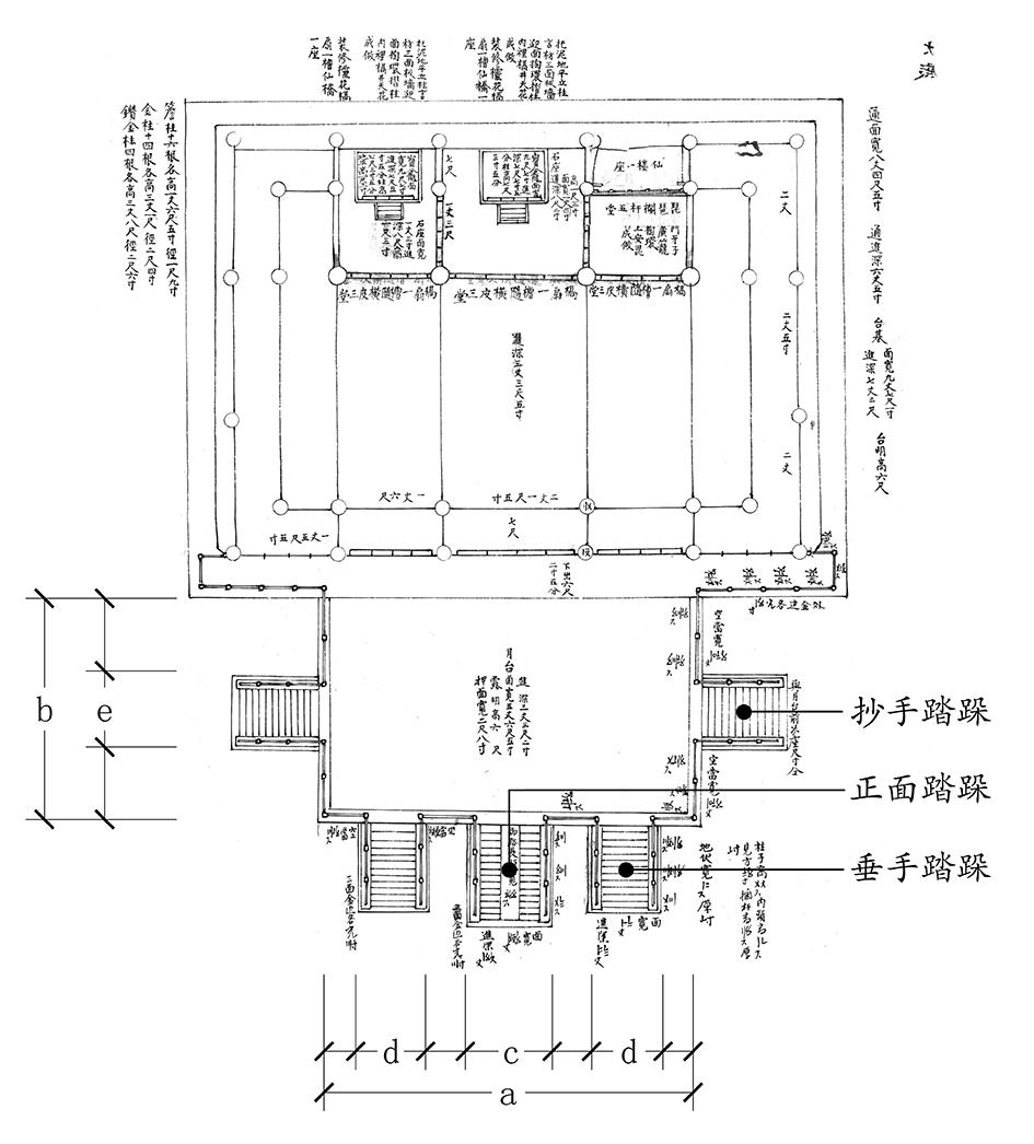 如殿宇前月台用垂手踏跺,面阔按月台通面阔,除去正面踏跺面阔,余若干,用四分之一,即得面阔。抄手踏跺面阔同垂手;如无垂手,按月台迸深三分之一即是。