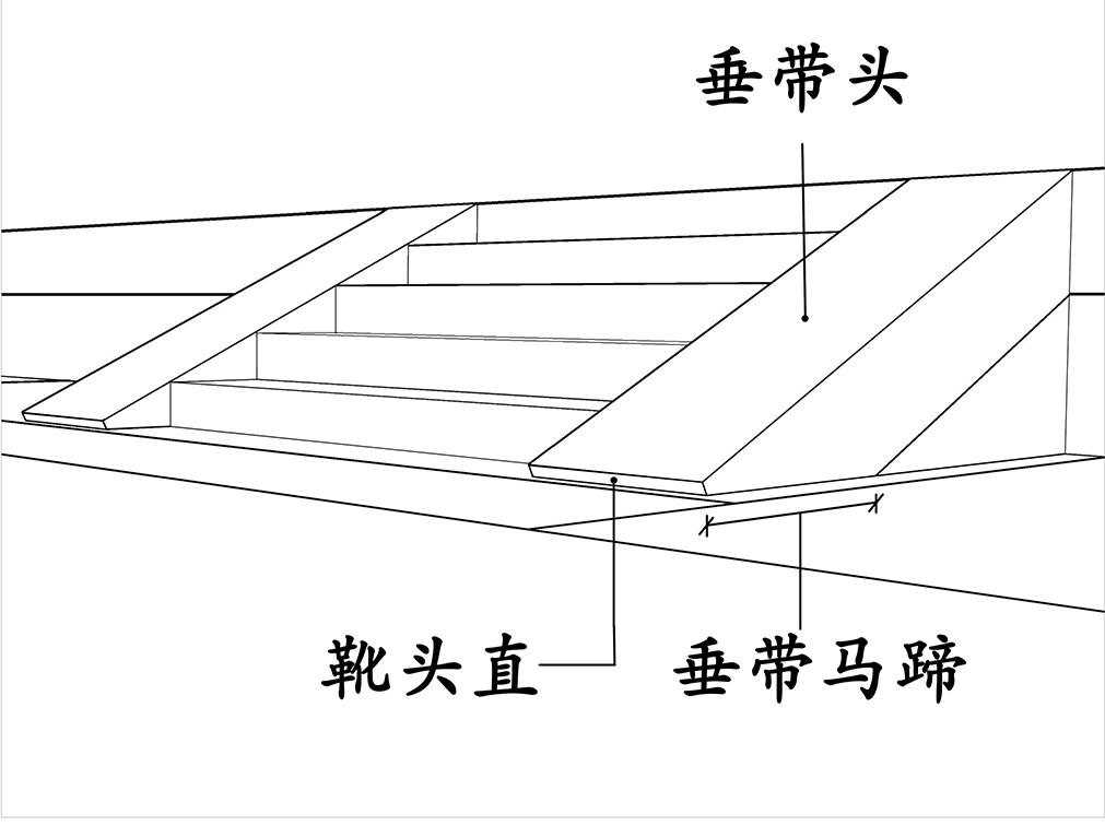 又如《营造算例·踏跺垂带》中,也载录有不少“怪诞无稽的名称”;而根据文字叙述和数据关系推算作图,其中关于踏跺垂带的尺度关系,以及迄未得到解释、而具体实物又一直不知所名的“靴头直”“垂带马蹄”“垂带头”等术语名词,均可释然(图13)。