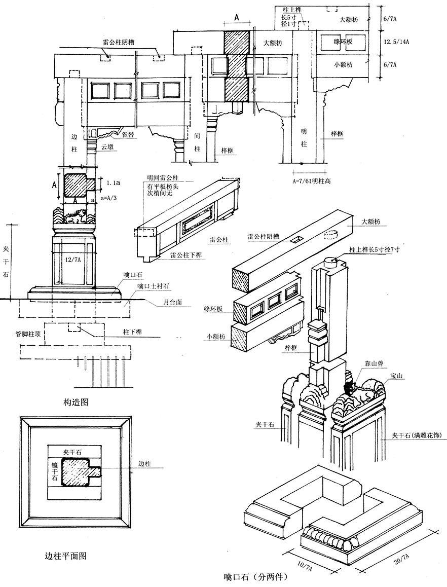 典型如《营造算例》第十章收录刘敦桢先生编定的《牌楼算例·五间六柱十一楼牌楼分法》,结合明长陵、清东陵孝陵、清西陵泰陵等共五座五间六柱十一楼石牌楼实物的测绘,根据该《牌楼分法》列举的数据,加以排比推算,作图分析,同测绘成果比较,结果不仅系统解读了该《牌楼分法》中的有关名词术语,而且实物各分件的名称也得到了合乎历史实际的指认。更重要的是,经过比较发现,该《分法》所表述的形象特征以及各部尺寸的比例关系,只有泰陵的石牌楼能够精确吻合,而非长陵和孝陵的石牌楼。这一事实说明,该《牌楼分法》显然应是雍正朝以后的产物(图14)。