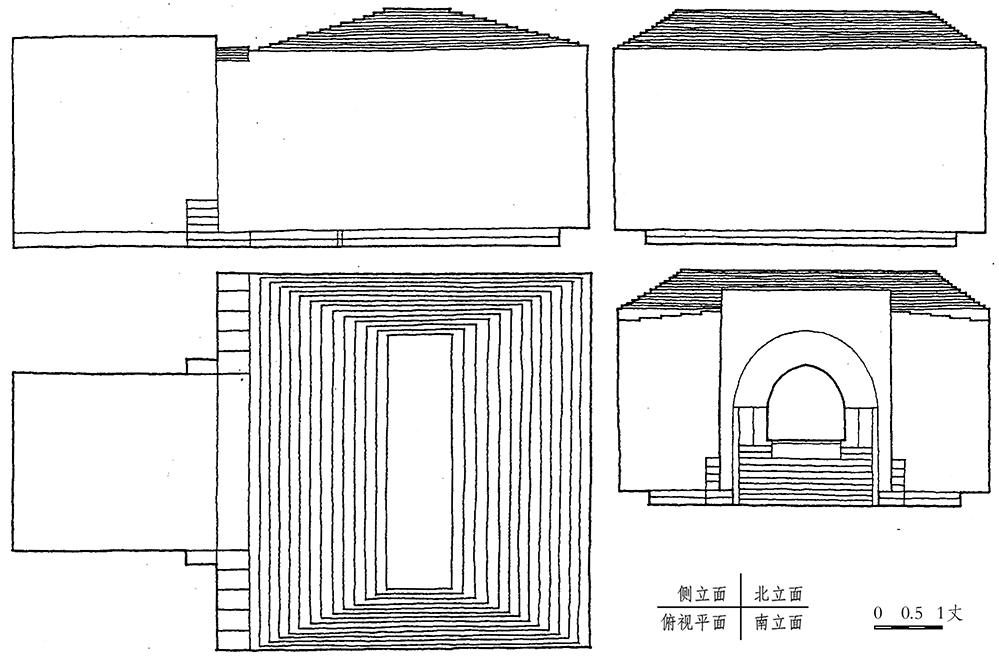 把自上而下、由外及里有关地宫砖石结构各个层次的剖析和推算作图成果加以综合整理,最后就可以得到较系统而完整的地宫结构构造复原图来(图6~图11)。